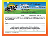 Mills Family Farm is a 200+ acre, veterinarian owned and managed, working cattle facility located in Mooresville, NC, where we raise cattle on grass pastures for beef. We offer local beef to the public and can ship nationwide. All of our beef is all natural, dry-aged for 14 days, raised without antibiotics and no added hormones. We provide gift certificates, custom beef cuts, and supply restaurants, catering businesses, and retail outlets in the Carolinas through a distribution network.